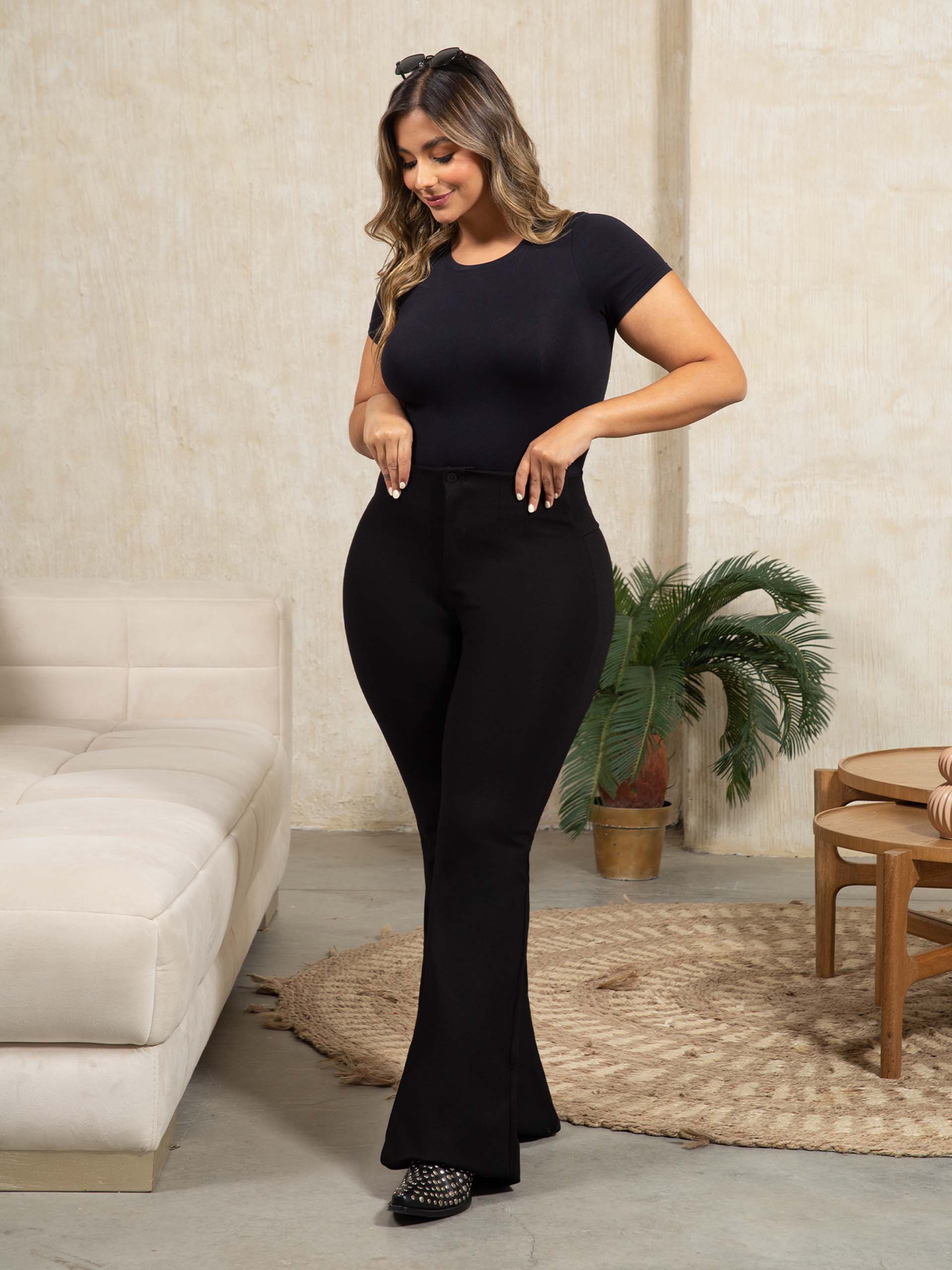 Ref 5357 es un pantalón en tela pontiroma sin pretina y con pinzas delanteras y es bota campana